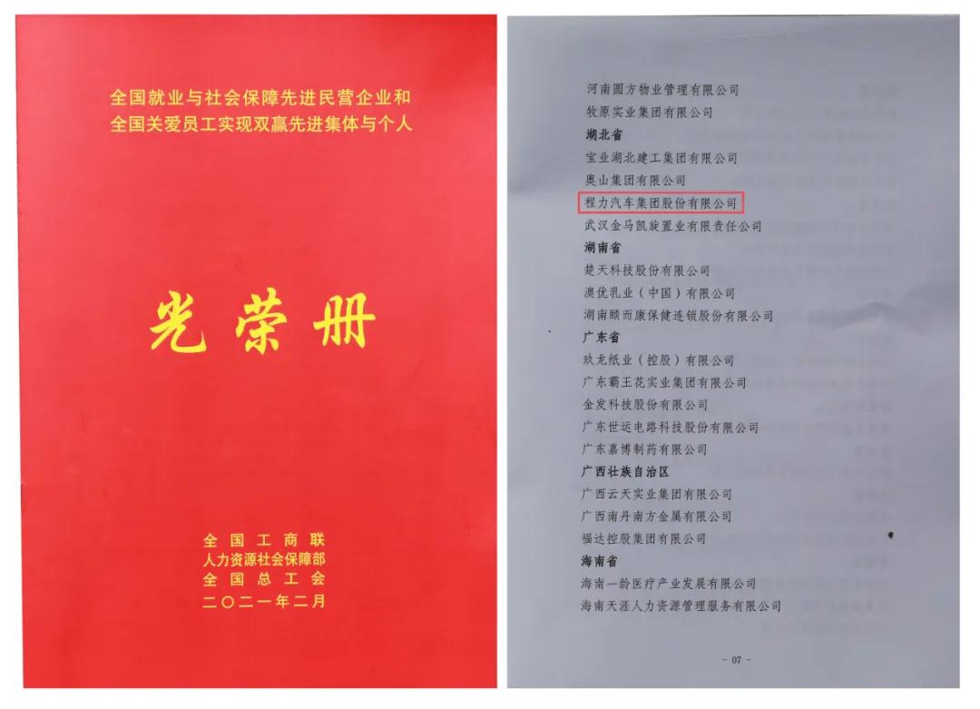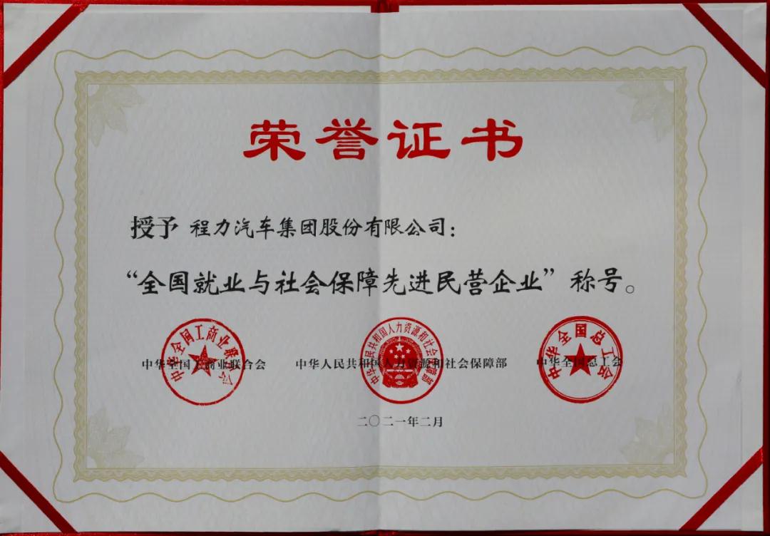 3月2日,程力汽車(chē)集團(tuán)股份有限公司收到國(guó)家人力資源和社會(huì)保障部、中華全國(guó)工商業(yè)聯(lián)合會(huì)、中華全國(guó)總工會(huì)聯(lián)合頒發(fā)的“全國(guó)就業(yè)與社會(huì)保障先進(jìn)民營(yíng)企業(yè)”榮譽(yù)證書(shū)及牌匾,這是程力汽車(chē)集團(tuán)股份有限公司在2021年初被授予的開(kāi)門(mén)紅全國(guó)性殊榮,也是程力集團(tuán)繼2020年連續(xù)三次受到全國(guó)性榮譽(yù)表彰。